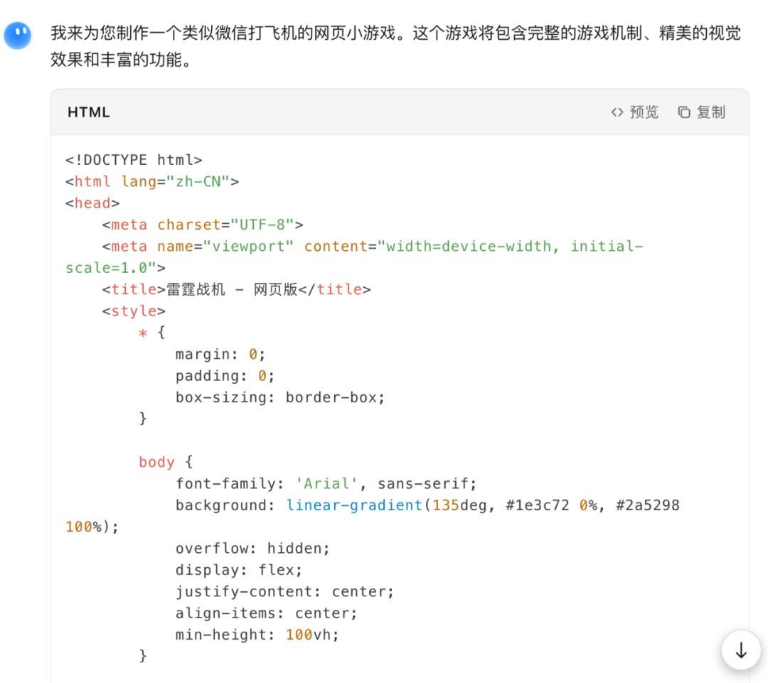 任务指令简单明了:「创建一个类似于微信打飞机的网页小游戏,要求既美观又富有趣味,功能齐全。」