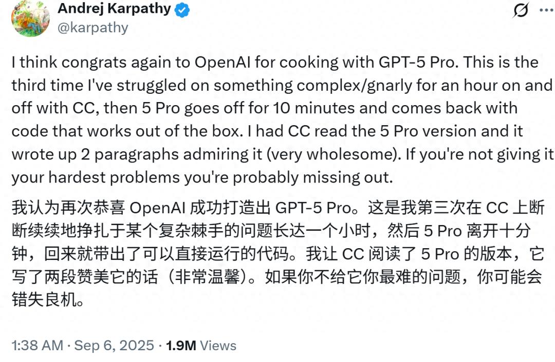 这一变化部分源于 OpenAI 的 GPT-5 系列模型强势崛起,尤其是在与 Claude Code 的对比中展现出强大的竞争力,AI 大师 Karpathy 也开始积极推荐 GPT-5 Pro 的卓越代码生成能力。