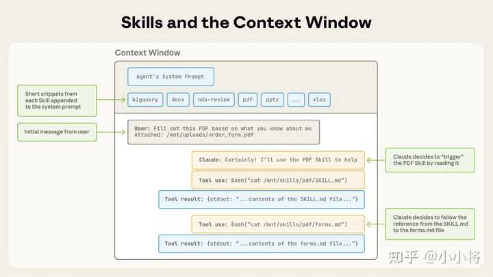 这种层次化的设计理念是使 Skills 灵活且可扩展的核心原则。可以将其比作一本结构清晰的手册,先有目录,再有具体章节,最后是详细附录。Skills 让 Claude 仅在需要时加载信息,从而减轻 LLM 的上下文负担。