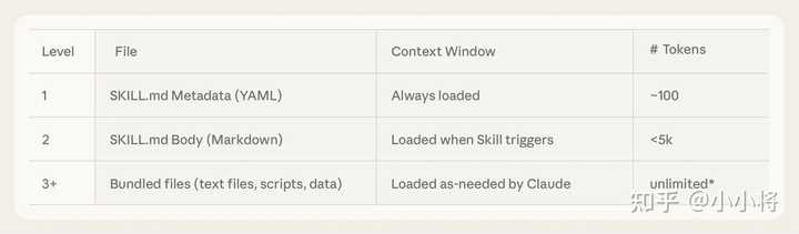 可以看出,YAML frontmatter 实际上是对这个 Skill 的简要说明,其性质与 Tool 的说明类似。在启动时,Agent 会将所有已安装 Skill 的名称和描述预加载到系统提示词中。这种轻量化的设计意味着可以安装大量 Skills,而不会占用过多的上下文空间,Claude 只需知道每个 Skill 的存在及其使用时机。