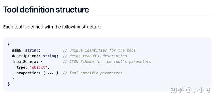 从上述 Skill 的定义和使用可以看出,Skill 需要与 LLM 紧密配合,并涉及多次交互。这一点与 MCP Tool 有明显区别。MCP Tool 的定义相对简单且具体,且需要一次性加载到 LLM 的系统提示词中: