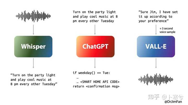 我认为这是最能体现 GPT-4o 实力的功能,因为它将改变人类与 AI 的互动方式。尽管之前有语音对话功能,但并非即时,而是将语音通过语音识别模型(Whisper)转化为文本后,再由 GPT-3.5/ 4 生成回应,最后再将文本转化为语音(Vall-E),这一过程的平均时间为 2.8 秒(GPT-3.5)和 5.4 秒(GPT-4)。