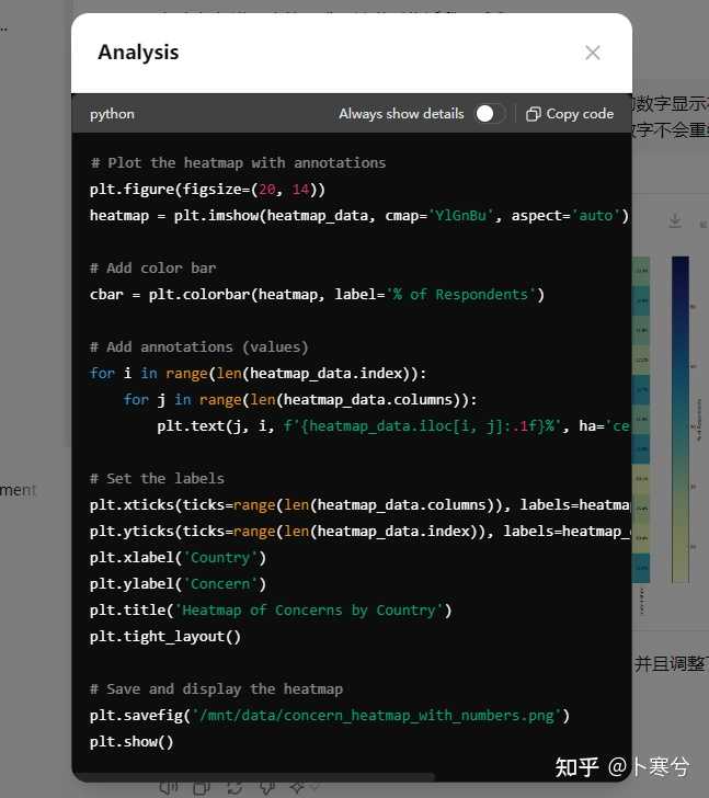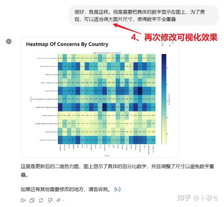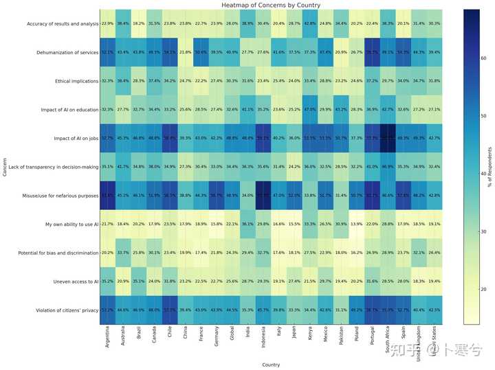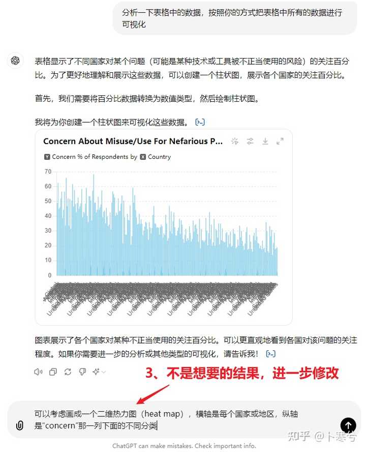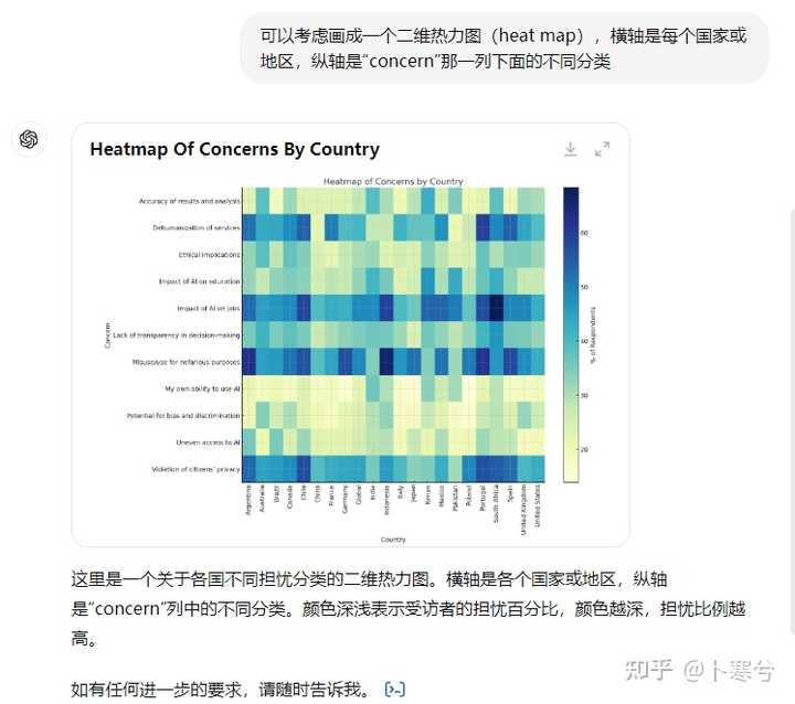 例如,以下是关于不同国家和地区对 AI 担忧状况的统计数据示例,展示如何使用 GPT-4o 进行数据分析和可视化。