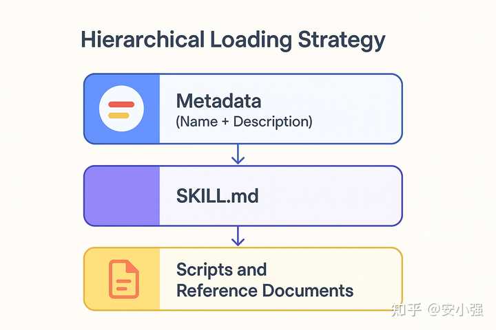 这一部分是 Claude Skills 设计的精髓,也是它与普通的 RAG/MCP/FunctionCalling 之间的主要区别。它是一种智能的、旨在节省上下文窗口的分层加载策略。