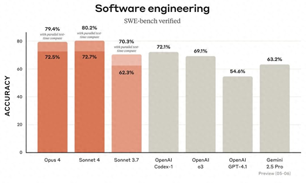 在权威的编程基准测试 SWE-bench Verified 中,启用扩展思考的 Claude Opus 4 和 Claude Sonnet 4 分别获得了 79.4% 和 80.2% 的得分,明显超越了 OpenAI Codex-1、OpenAI o3、OpenAI GPT-4.1 以及 Gemini 2.5 Pro 等竞争对手。