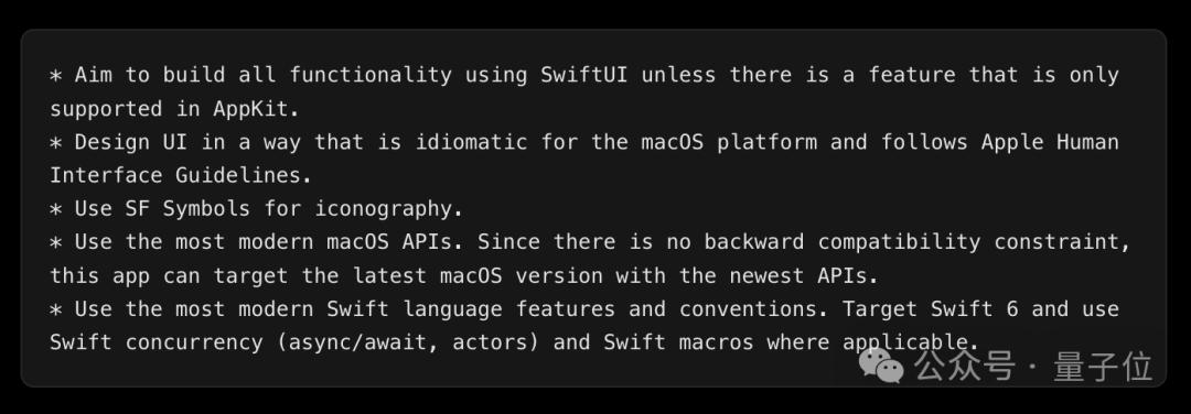 为了帮助 Claude 避免常见的错误,Indragie 特别设计了一份名为 CLAUDE.md 的文档,其中详细说明了现代 API 的基本使用方法。