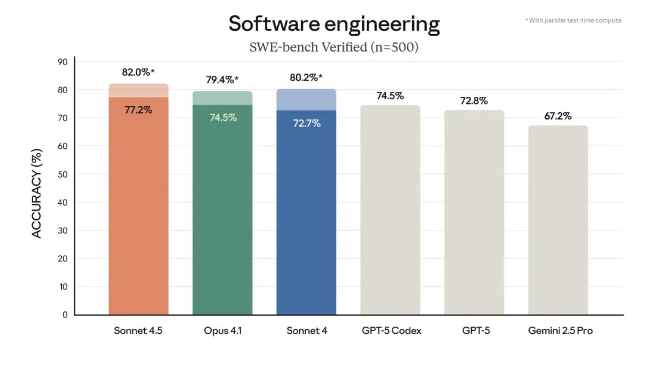 首先,Claude Sonnet 4.5 在 SWE-bench Verified 测试中展现了卓越的编程能力,直接位居行业顶尖。