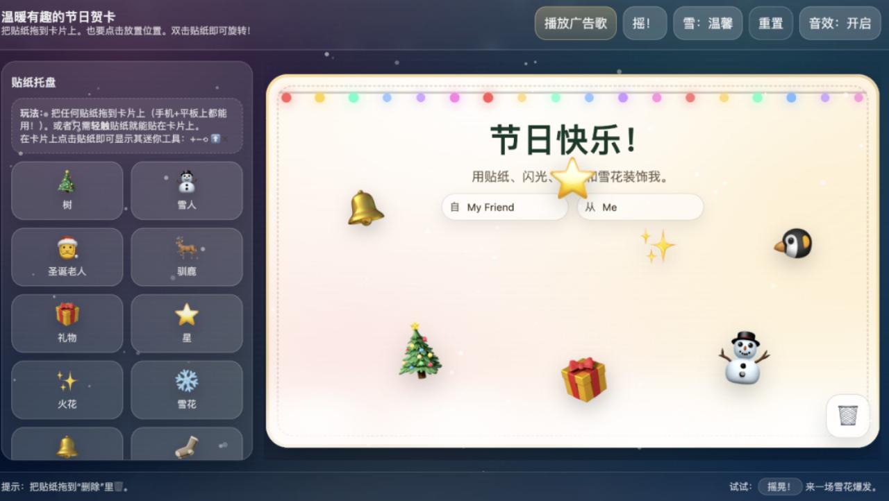 OpenAI还提供了一些根据单一提示生成的示例,如海浪模拟器、节日贺卡生成器和打字雨游戏。仅凭一个提示词,便能生成完整的单页应用,具备可调节参数、逼真的动画效果及平和的用户界面风格,所有功能一应俱全。