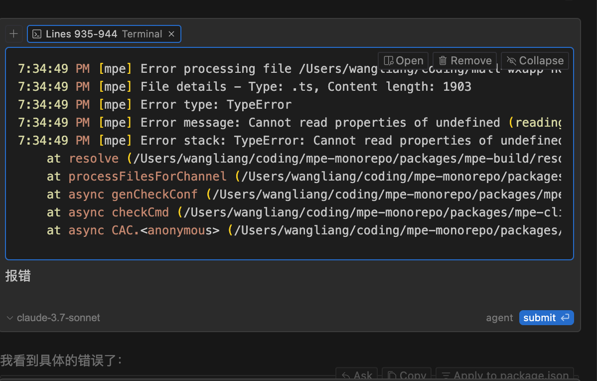 例如,我们可以编写一个用于访问公司内部 JavaScript 错误监控的函数,并在 Cursor rules 中说明访问方法。接着,直接询问它关于昨天某个页面的 JS 错误情况,它就能给出相应的反馈。