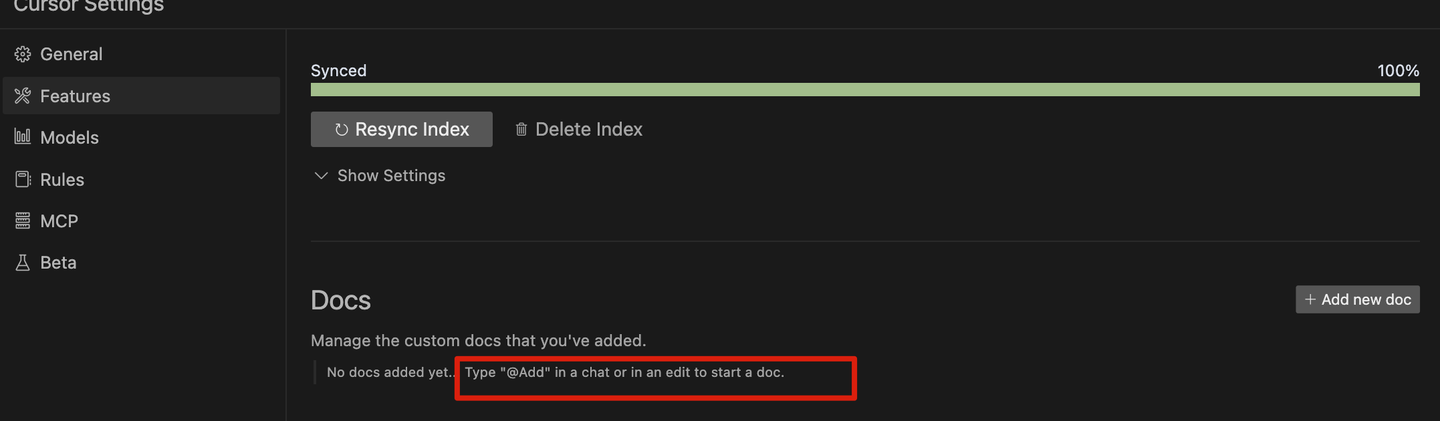 得益于 Cursor 的索引仓库能力,我们只需将所有文档放入一个文件夹中,待索引完成后,就可以向它询问与文档相关的问题。
