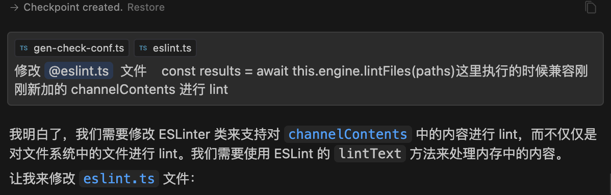 在原项目中,我们使用 lintFiles 方法进行代码检查,传入的是文件路径。然而,由于我们生成的是文件内容,lintFiles 无法再使用。于是,系统智能地将其替换为 lintText 来进行代码的检查。