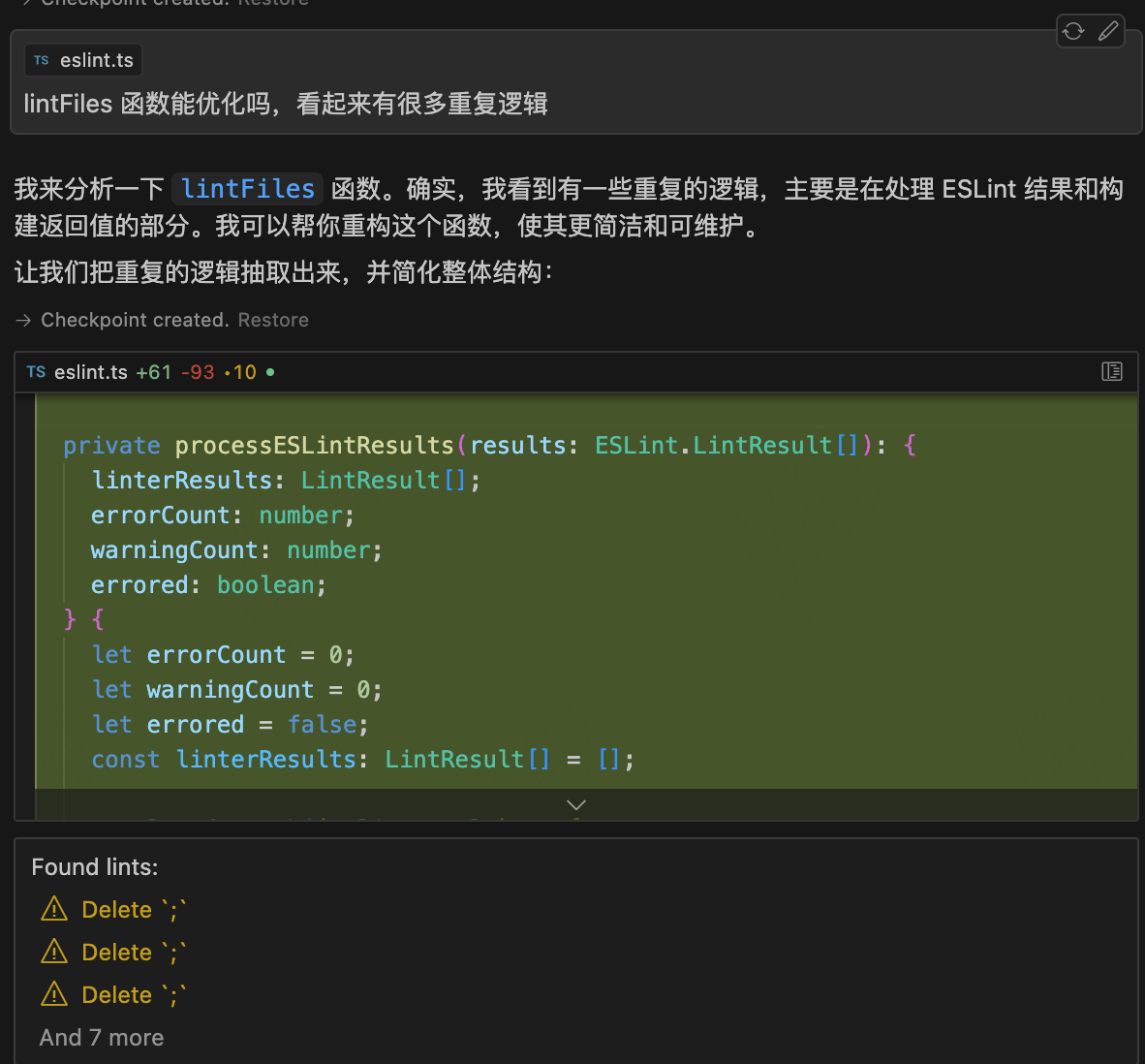 随后,Cursor 就生成了我们所需的代码,整个流程其实已经顺利完成。而更令人感到惊喜的是,Cursor 对 eslint 的使用比我更为熟悉。
