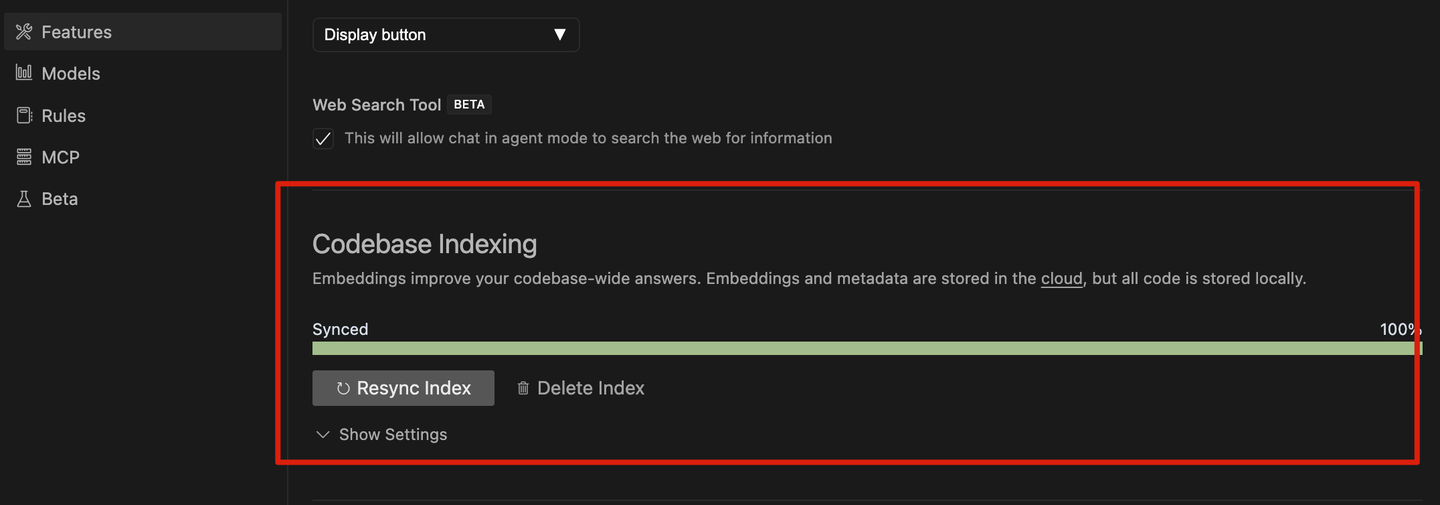 增加了代码库的索引功能,允许基于整个代码库完成特定任务。在 Ask 模式中,可以主动 @Codebase,而在 Agent 模式下则会自动搜索整个仓库。