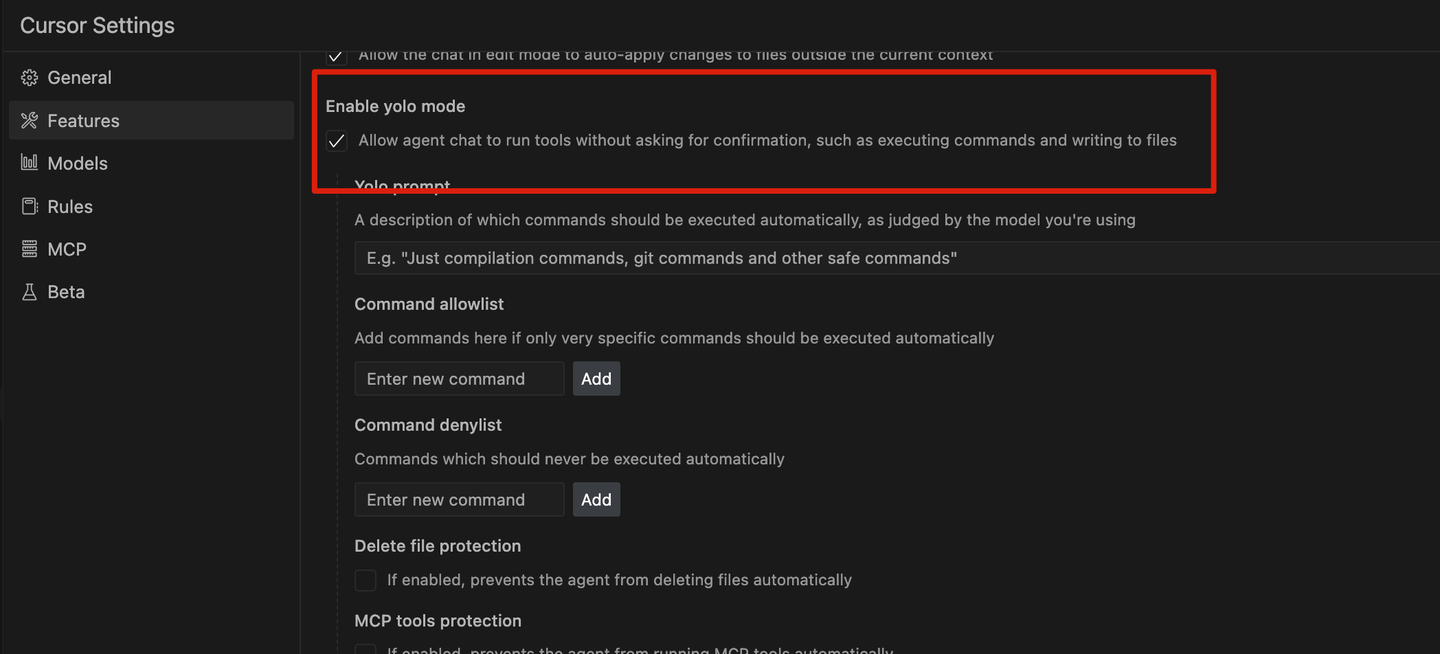 可以开启 yolo 模式,这样在执行命令行时无需再次确认。为了安全起见,系统还提供了一些禁止执行命令的配置选项。