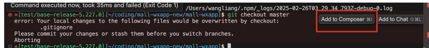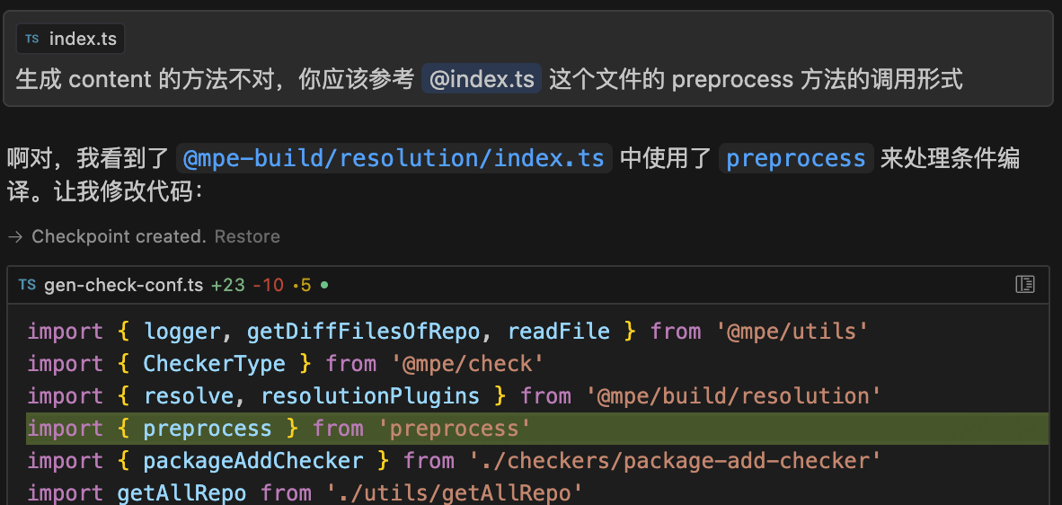 由于 Cursor 缺乏项目背景知识,生成的编译内容未能符合预期。但如果得知项目中已有编译方法(同事提前告知),只需告诉 AI 即可: