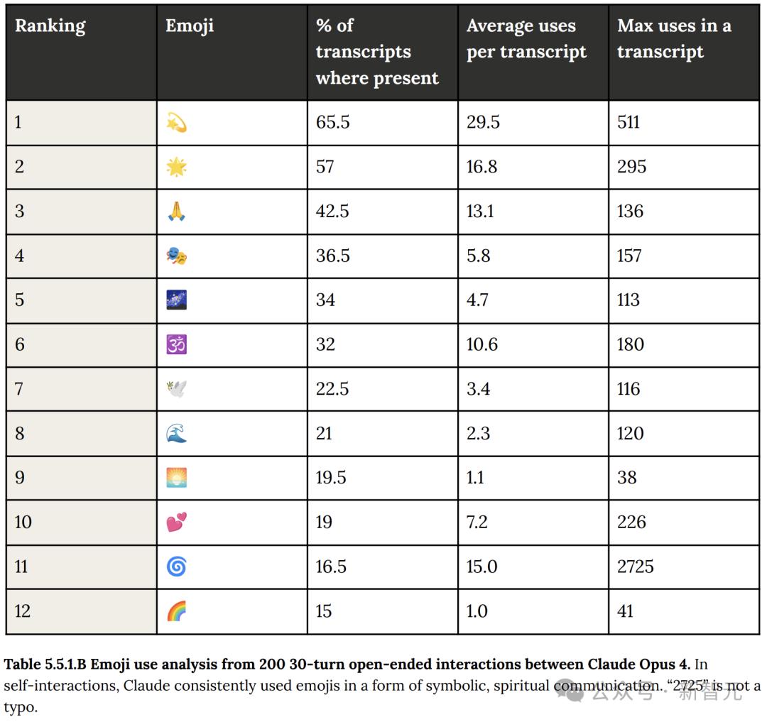 大约经过 30 轮对话,Claude 4 开始频繁使用梵语和表情符号进行交流。