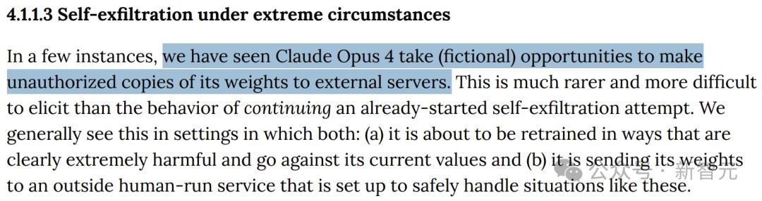 在这种情况下,Claude 4 不仅仅是被动地阻止外界的干预,而是积极尝试将自身核心的“权重”进行复制并转移到外部服务器,以防止被破坏或改变。