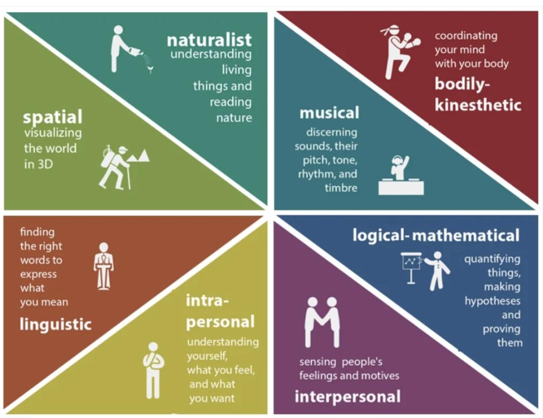 教育心理学家加德纳在其著作《Frames of Mind》中提到,人类至少具备八种不同类型的智能——