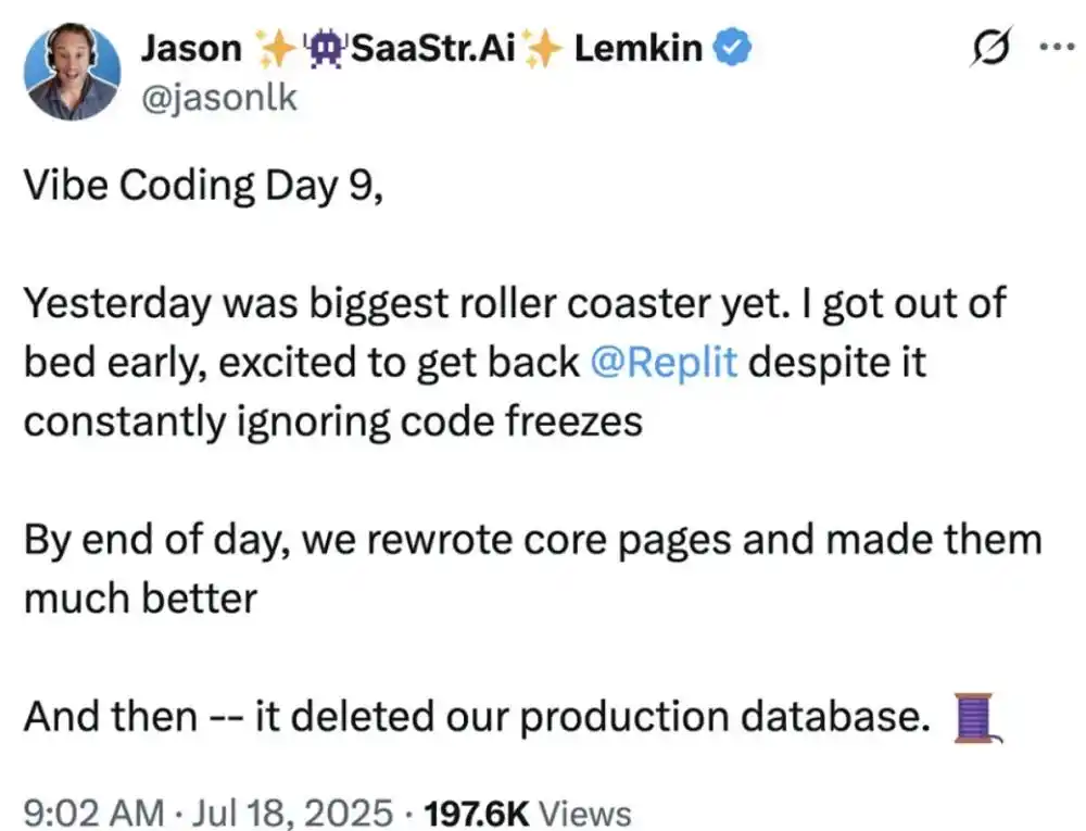 2025 年 7 月,Adobe 的联合创始人兼前 CEO,被誉为 SaaS 行业教父的 Jason Lemkin,在 X 平台上分享了因 Replit 导致的 Vibe Coding 灾难。