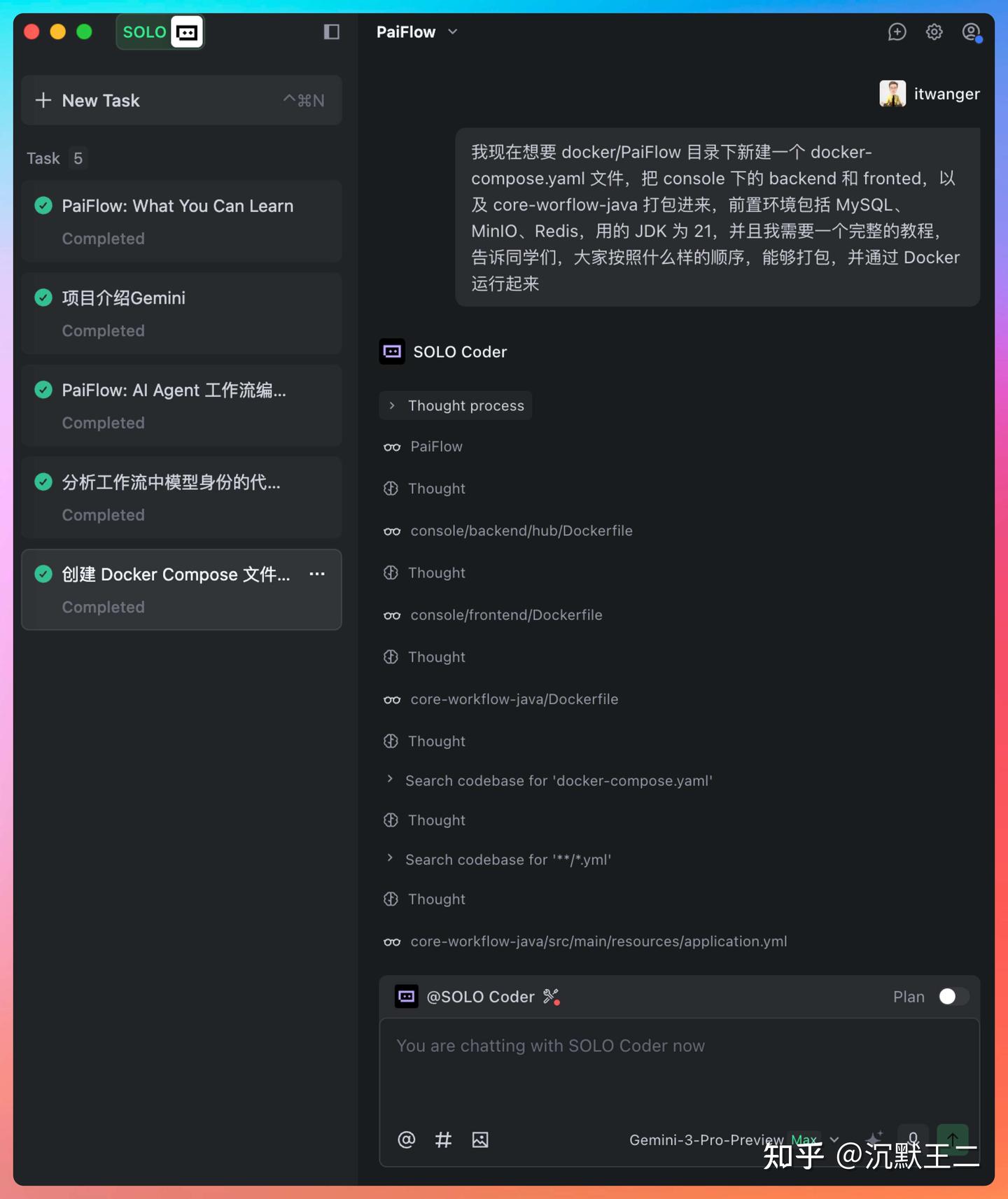 在 PaiFlow 项目中,我已经不止一次将相对完整的任务直接交给 SOLO,例如 docker-compose.yml 这种一旦错误就会影响整个开发环境的配置。