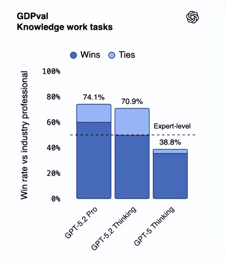 GPT-5.2在性能上的提升不仅全面,而且明确可指向。OpenAI推出了新的评估标准GDPval,旨在评估模型在实际经济价值相关任务中的表现。在涵盖了44种职业的知识工作任务中,GPT-5.2 Thinking版本在70.9%的情况下超越或与顶尖行业专家持平。这一定位表明,GPT-5.2的主要目标是成为“专业领域最强大的模型”。