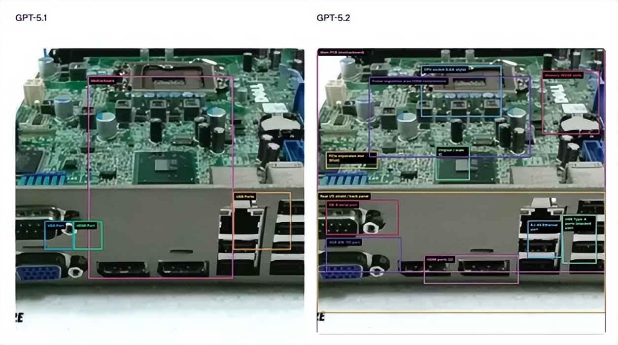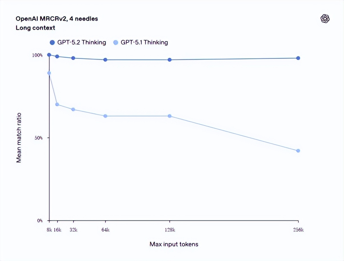 GPT-5.2 Thinking在关键性能上实现了显著增强。其事实准确性得到了显著提高,有效减少了信息的“幻觉”。对于长上下文的处理和关联能力更为精准,视觉理解能力达到了OpenAI模型的新高度,在图表推理与软件界面解析任务中的错误率比前代降低了近50%,并对图像中元素的定位关系有了更好的掌握。对于寻求可靠支持的专业用户来说,可靠性的提升远比单纯的能力展示更具意义。