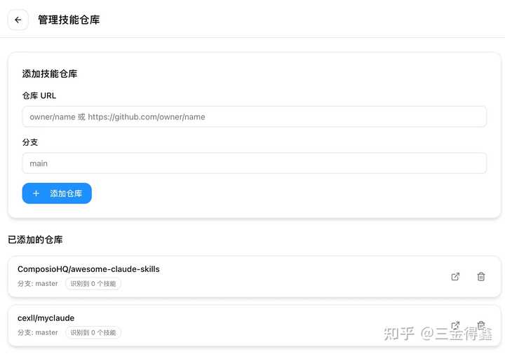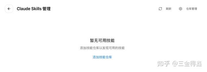进入 Skills 窗口后,我们可以点击仓库管理以配置技能仓库连接,从而添加 Claude Skills: