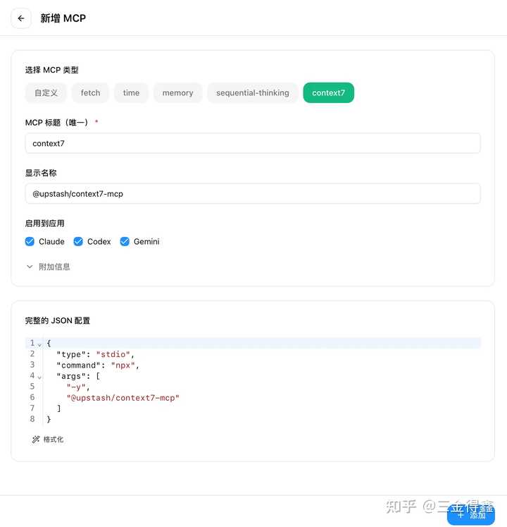 点击右上方的 + 按钮,添加一个 context 的 MCP: