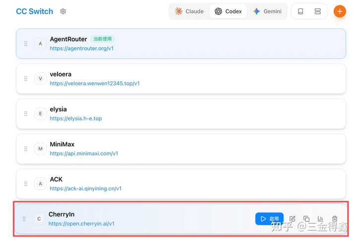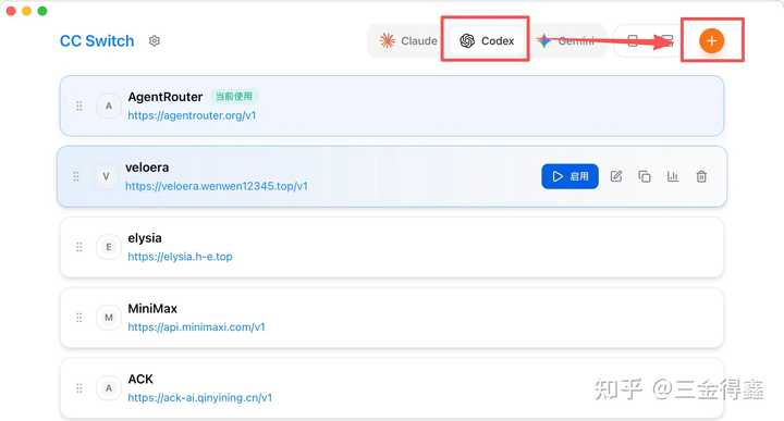 首先选择要使用的工具,接着点击右上角的橙色 + 按钮,即可开始配置 API。以 Codex 为例: