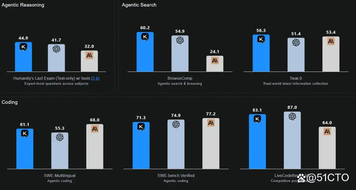在各项基准测试中,K2 Thinking 展示出了令人瞩目的成绩,特别是在需要长期推理和工具运用的领域。其编程能力全面且均衡,在多个测试中表现出色,分别在 SWE-bench Verified、Multi-SWE、SciCode 和 Terminal-Bench 等评测中获得了 71.3 分、41.9 分、44.8 分和 47.1 分的优异成绩。尤其是在 LiveCodeBench V6 的测试中,K2 Thinking 以 83.1 分的佳绩凸显了其在多语言处理和智能体工作流程中的强大能力。