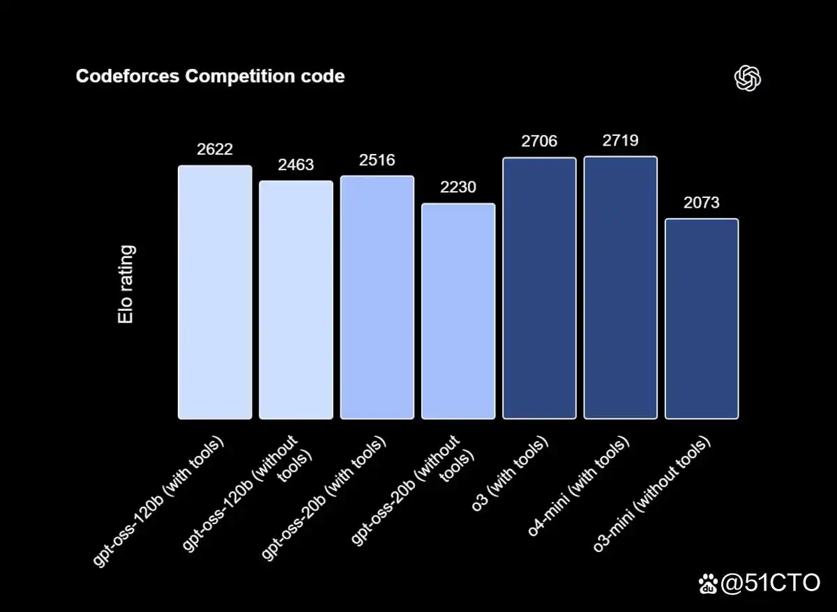 在诸如竞赛编程(Codeforces)、通用问题求解(MMLU、HLE)以及工具使用(TauBench)等领域,GPT-OSS-120B 均超过了 o3-mini,并且在许多方面的表现与 o4-mini 相当或更佳。此外,该模型在健康评估(HealthBench)和竞赛数学(AIME 2024 和 2025)方面的成绩同样优于 o4-mini,显示了其全面的竞争力。