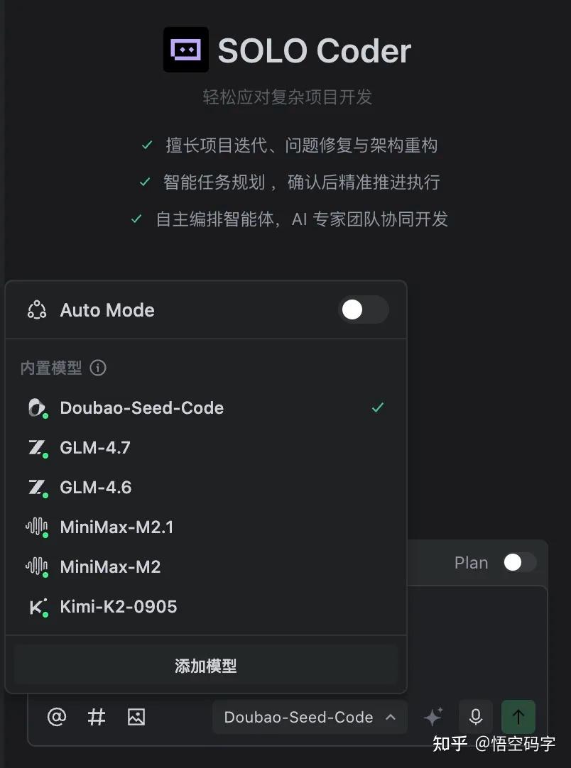 内置的模型有:Doubao-Seed-Code、GLM-4.7、GLM-4.6、MiniMax-M2.1、MiniMax-M2 和 Kimi-K2-0905。