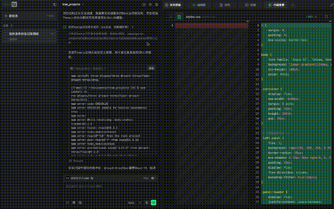 借助全新的三栏布局和代码变更工具,TRAE SOLO 实现了其设计理念中的 第二个目标:编码过程「实时可感知」。