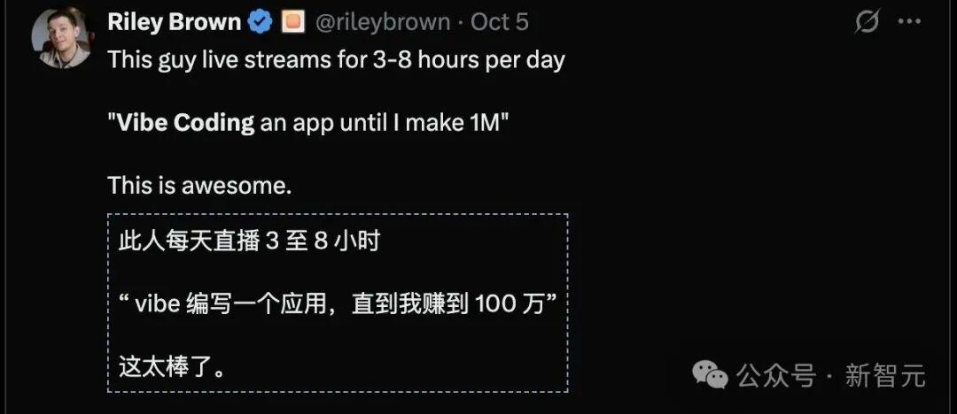 许多业界领军人物甚至直播使用氛围编程构建应用,直到赚取 100 万才结束直播,且成功实现了目标。