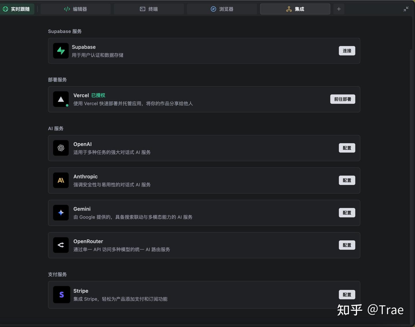 SOLO 集成了多种工具,如 Supabase、Figma、Vercel、Stripe 和 AI Service 等,您可以在同一个平台内便捷地访问数据库、解析设计图纸、一键进行部署、集成支付模块及配置模型服务,减少在不同应用之间的频繁切换。