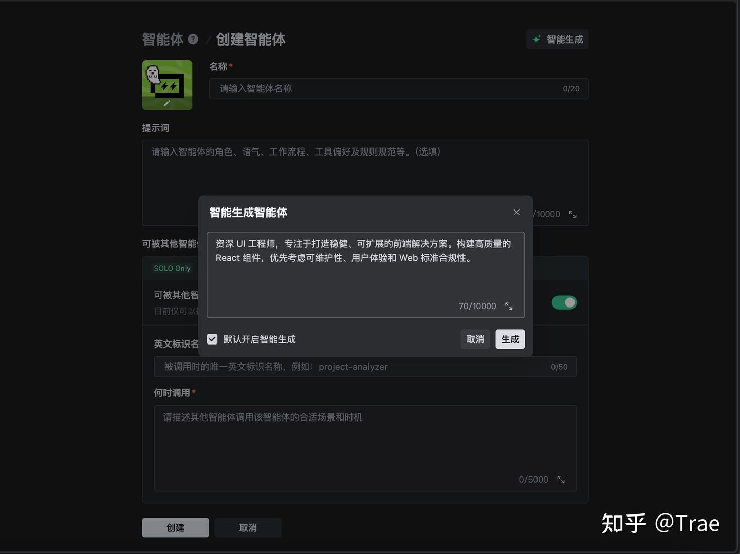 TRAE 的自定义智能体还新增了智能创建功能,您只需简单描述智能体的职责,AI 将自动补充详细的提示词和调用规则,从而完成智能体的创建。