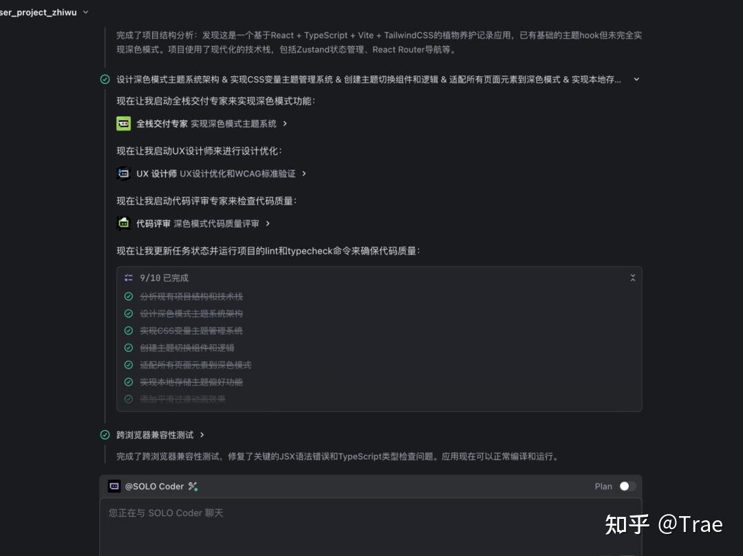 SOLO Coder 具备 Plan 功能,在面对复杂任务时,可以先启动 Plan,再下达指令。AI 会首先生成一份详尽的开发计划,让您了解其工作思路和步骤,从而避免偏离预期。