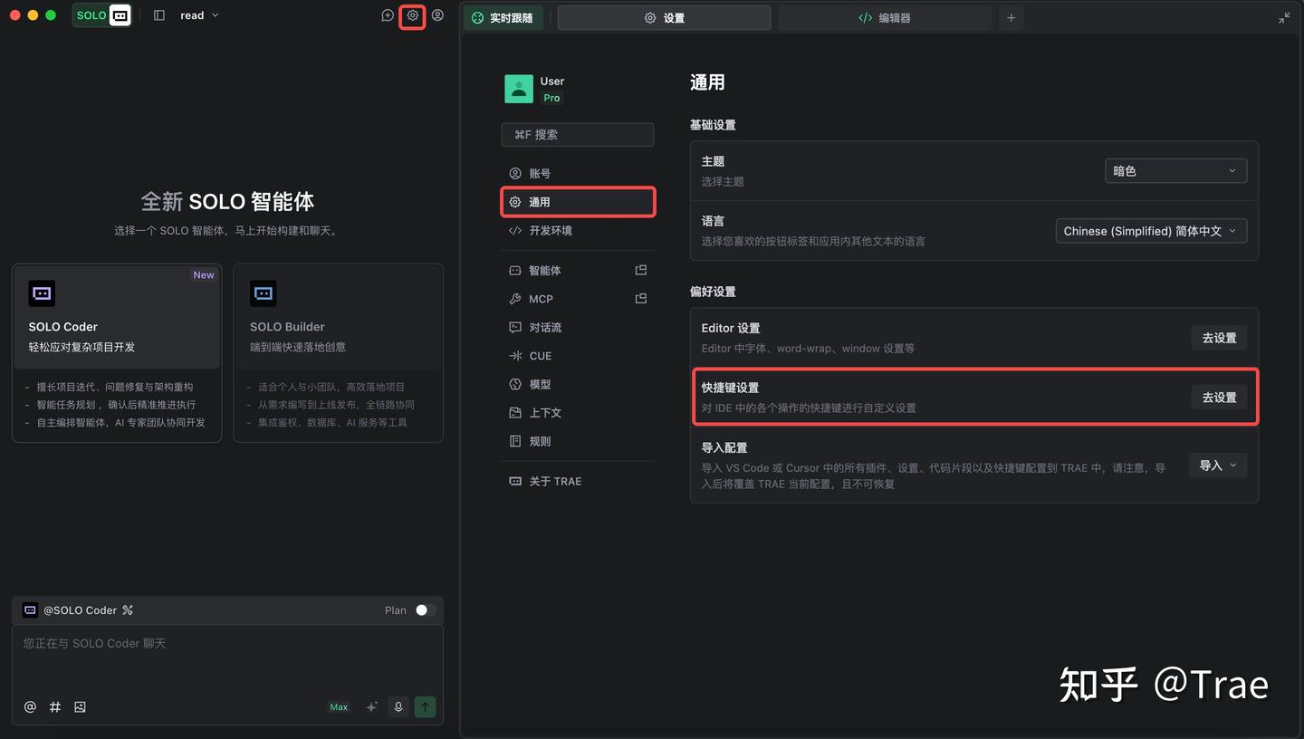 TRAE 提供了一系列常用快捷键,您可以直接使用或自定义配置,以下是部分 SOLO 模式下的默认快捷键。