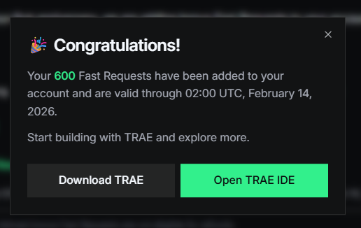 字数 270,阅读大约需 2 分钟 ——TRAE 周年庆典|国际版上线一周年,免费赠送 600-800 次 Fast Request 福利! 周年庆特别优惠:领取 Fast Request 权益 • 活动时间 :1 月 14 日 10:00 起限时开放领取 • 面向用户 :所有 TRAE 国际版用户(包括 Free 免费用户与 Pro 付费用户) • 权益详情 :✅ Free 用户:可获得 600 次 Fast Request,使用期限至 2 月 14 日 10:00(不少于 1 个月 Pro 会员的使用量);✅ Pro 用户:额外获得 800 次 Fast Request,使用期限延长至 3 月 14 日 10:00,续费用户可享更优福利; • 适用范围 :TRAE 国际版的 IDE 与 SOLO 双模式均可使用,在权益有效期内,所有内置模型皆可享用。 快速领取,抓紧时间享受 方式一:直接在 IDE 中领取 启动 TRAE 国际版 IDE,点击顶部横幅「领取周年福利」,即可跳转至活动页面进行领取;