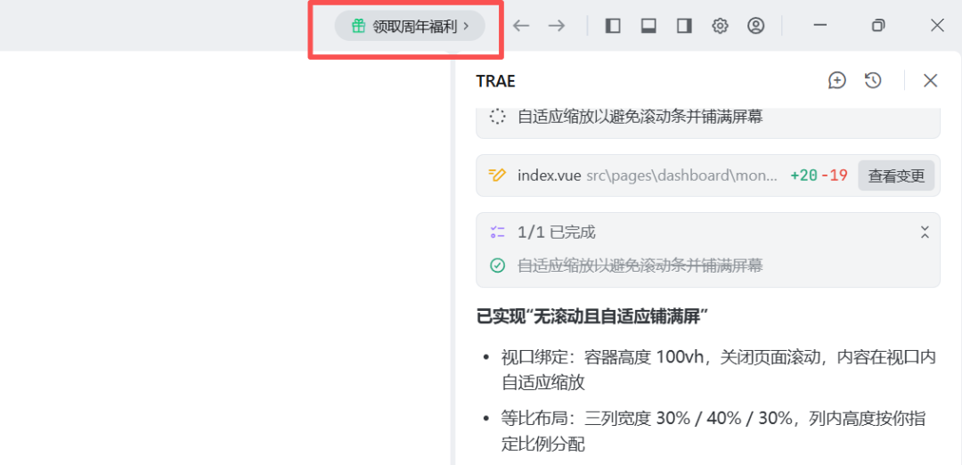 启动 TRAE 国际版 IDE,点击顶部横幅「领取周年福利」,即可跳转至活动页面进行领取;