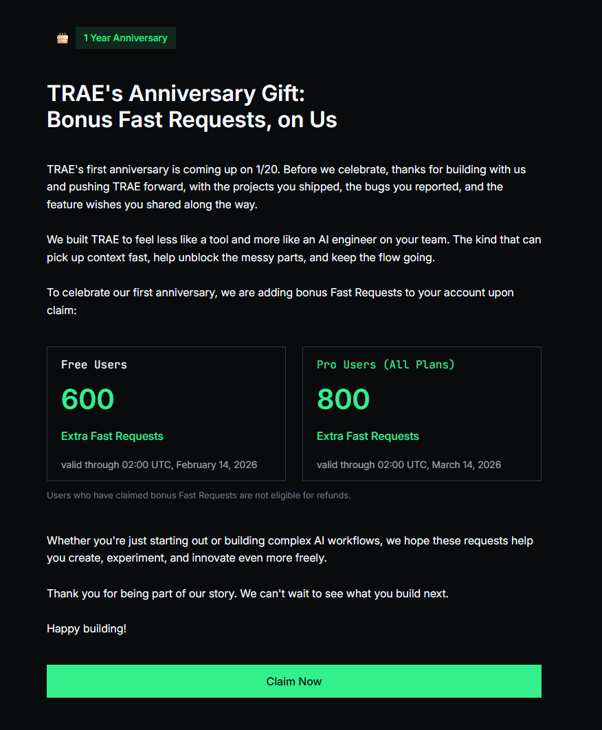 ——TRAE 周年庆典|国际版上线一周年,免费赠送 600-800 次 Fast Request 福利!