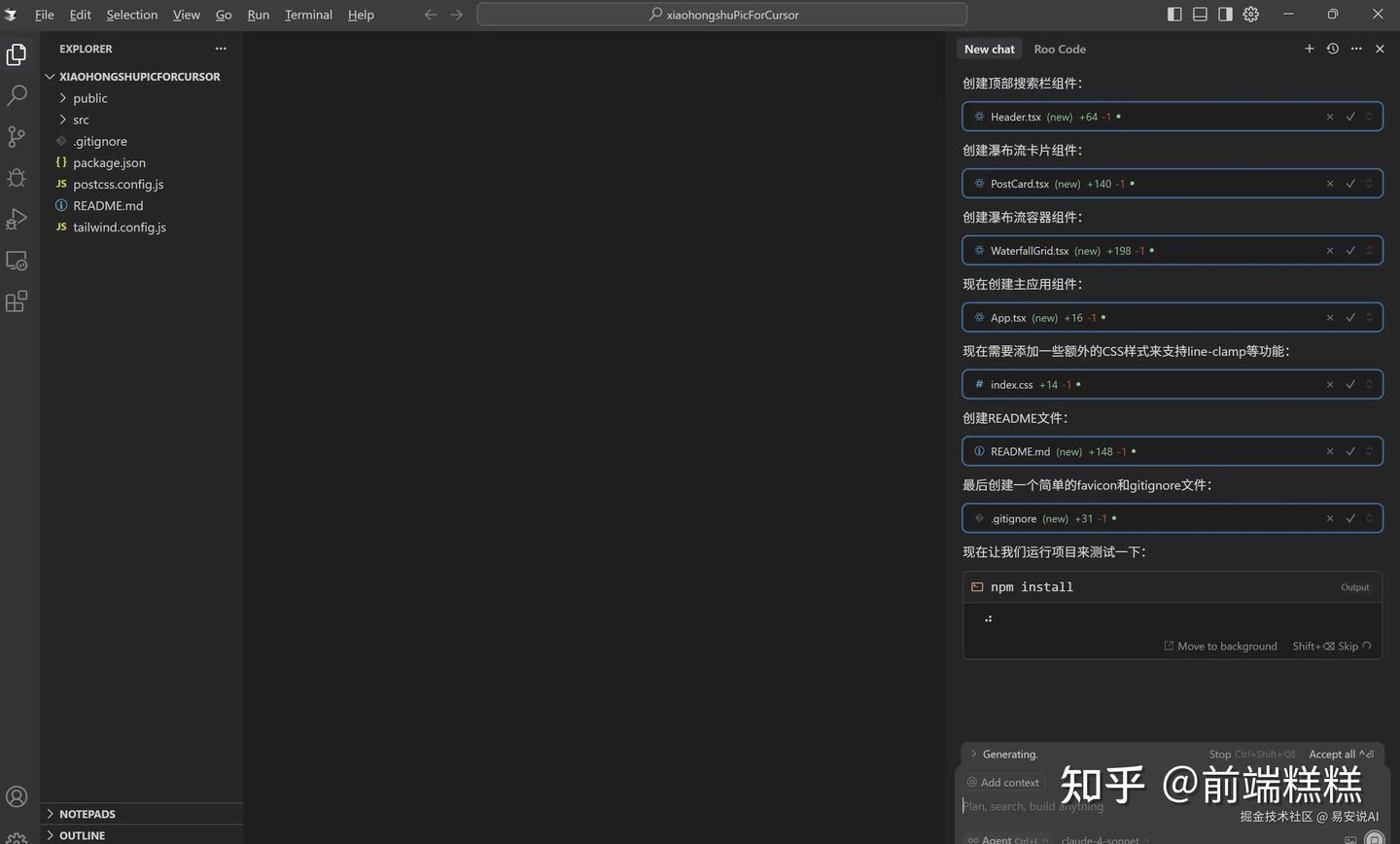 同样将提示词复制给 Cursor,项目生成成功,但在依赖安装时却一直卡住。