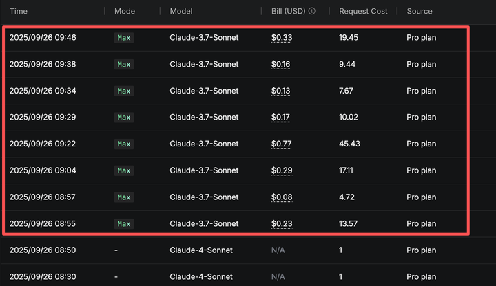 在 9 月份,我真实地体验了一次,开启 Max 后 Token 迅速减少,我在那个月只用了一个小时,就计费了超过 100 次,通常情况下可不是这样计算的。