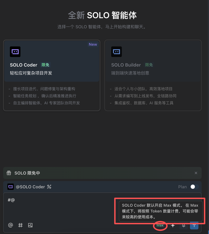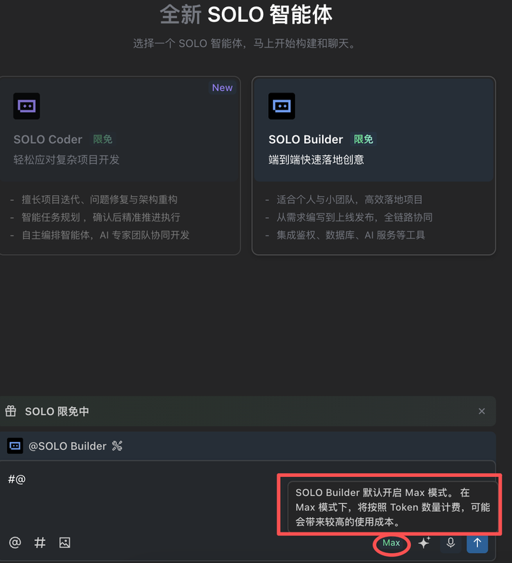 在 SOLO 模式下,SOLO Coder 和 SOLO Builder 为单选题,不论选择哪个,都是默认开启 Max 模式,并且 提示你可能会产生较高的使用费用.