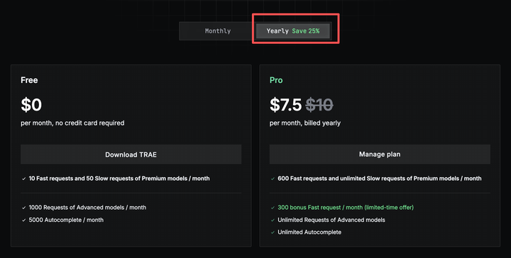 Trae 的会员分为三种类型,分别是首次订阅、续费和年费。