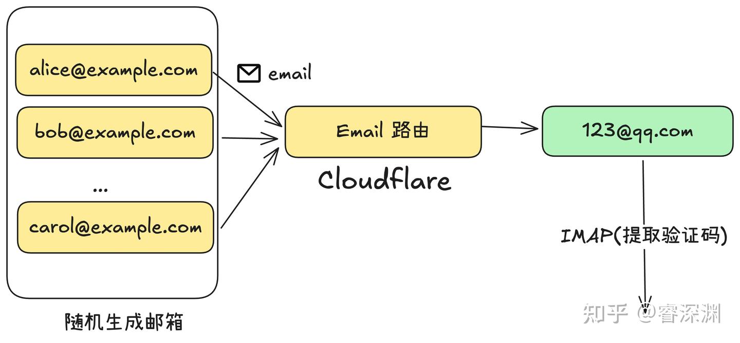 该工具的基本原理是生成任意前缀的邮箱账户,该账户位于您的域名下,并通过 Cloudflare 托管域名,配置邮件路由,将所有不存在的、任意前缀的邮件全部转发到一个特定的可用邮箱,从而获取验证码。