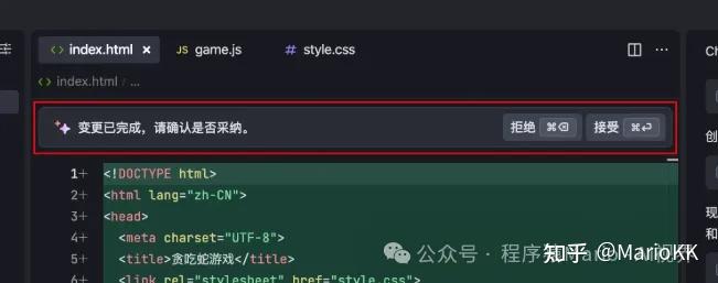 根据你的需求,AI 助手将自动创建新文件或修改现有文件,并保存生成的代码。你可以选择接受或拒绝这些变更,包括: