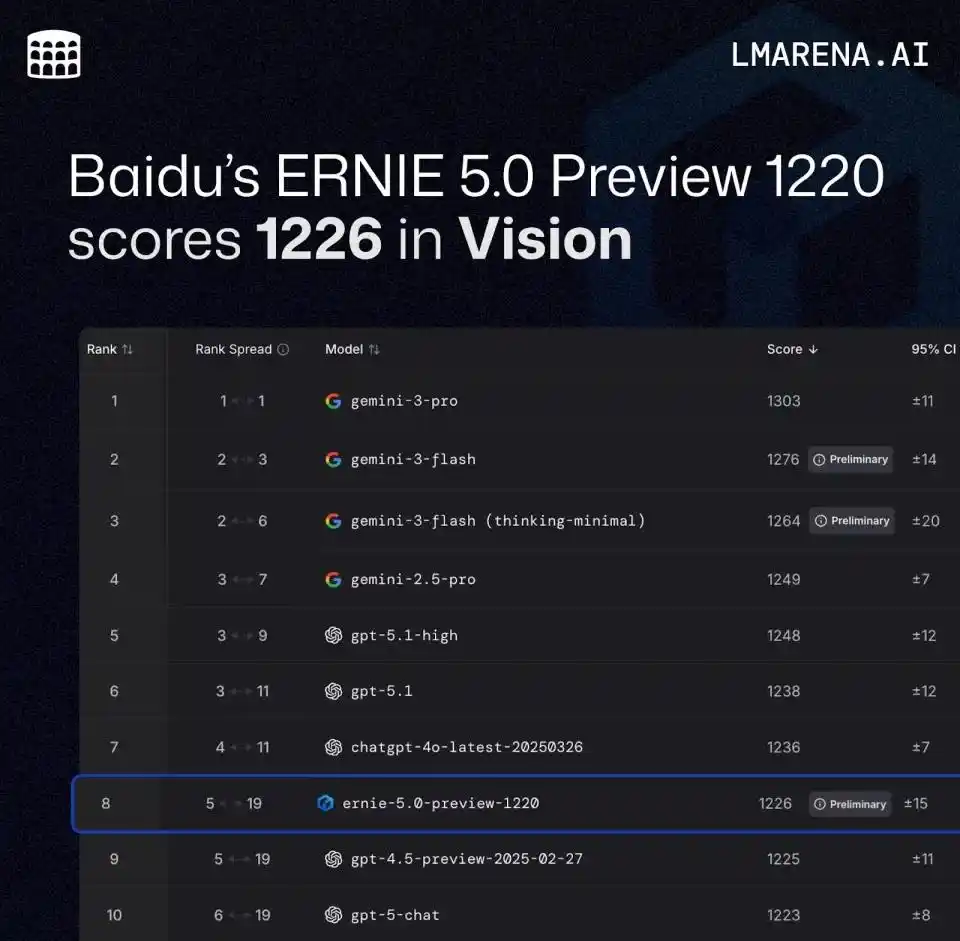 如今的 AI 创业者们相对幸运:基础模型、AI 芯片及应用场景均可按需获取。百度历经艰辛,走过许多弯路,最终奠定了体系化的基础。文心大模型 5.0 在最新的 LMArena 大模型竞技场排名中,取得了文本榜国内第一、数学能力榜全球第二、视觉理解榜(Vision Arena)中国第一的佳绩,成为唯一进入全球前十的中国大模型。