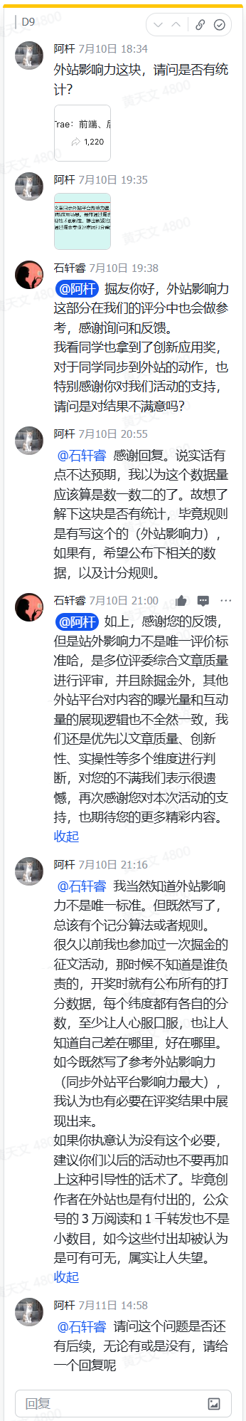 - 最终活动开奖后,我在获奖名单中评论关于 “外站数据是否统计” 的问题,得到的回复竟是,“有参考,但不作为关键数据和必要要求”。而活动规则明确要求外站影响力最大,然而这里却不承认了。
