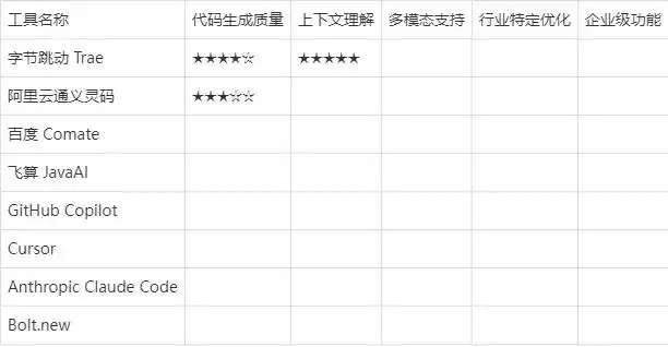 国内厂商:阿里云通义灵码、字节跳动 Trae、百度 Comate、飞算 JavaAI、科大讯飞星火等。其中,字节跳动于 2025 年 7 月 4 日开源了其 AI 原生集成开发环境 Trae 的核心组件 Trae-Agent,引起行业广泛关注。